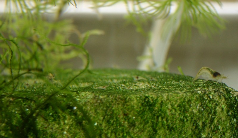 ブラインドのすきまから漏れた日光があたるので、水槽のなかのブロックは緑色に苔むしている。それをエビだちは喜んでついばんでいる。