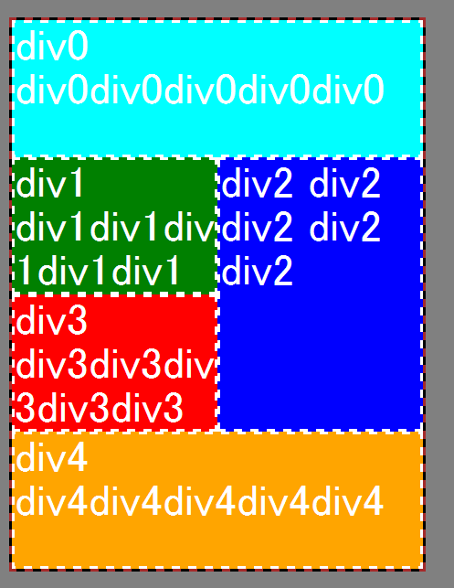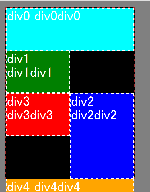 勉強のために下記のようにdivでブロックを作り、フローレイアウトで配置してみる。普通に考えるとdiv0はそのままdiv1はfloat:left,div2はfloat:right,div3はfloat:left,div4はclear:bothでいけるはずだ。